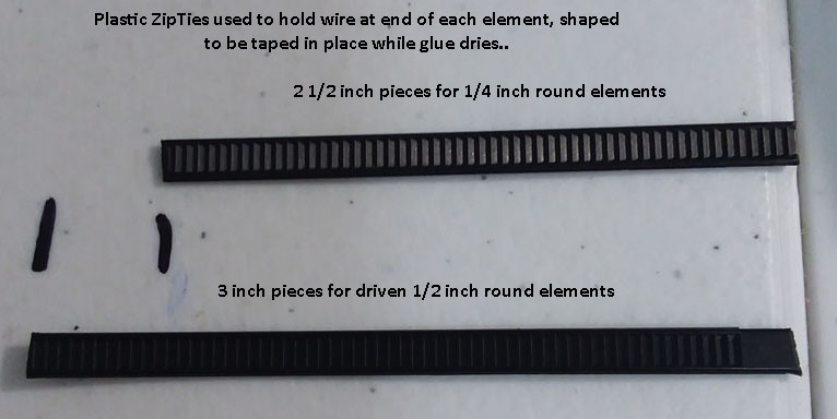 Becuz of the crazy outside HOT heat this summer, some of what would be next is being done inside home. I came up with the idea of cutting different lengths of zip-ties to be bended and folded so they can be taped in place to hold the loop wire on the ends of the elements, while I glue them to dry and stay there. Of course, its all NOT electrically conected to original beamer, or conductive in any way.