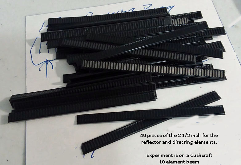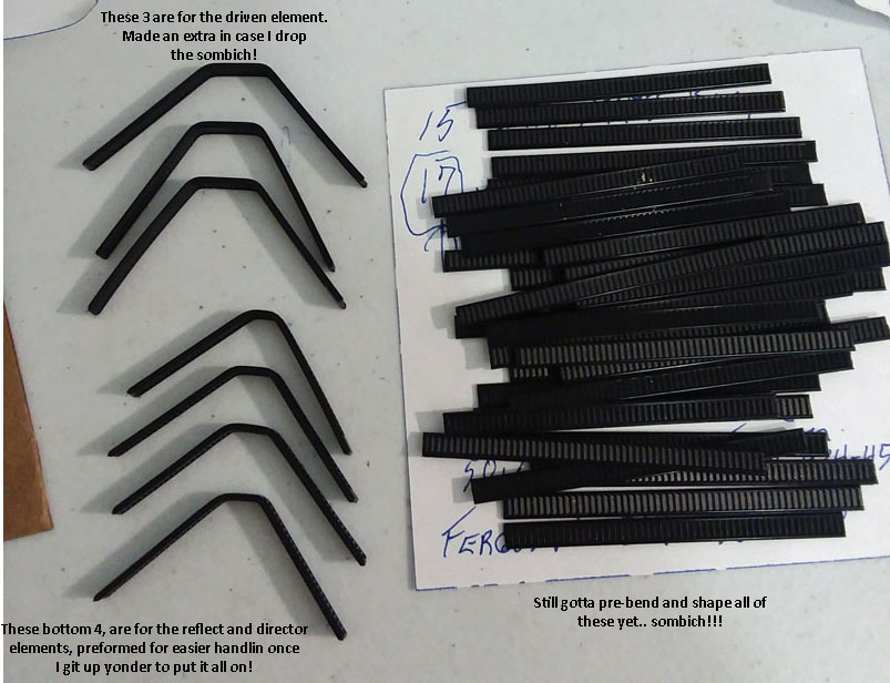 Well.. got them all, except the front director element. Ran out of wire! Had 3 feet of it left off the roll of 100ft. Oh well. Git some more soon. The 14ft of the 100ft wire roll, I had used for when I made that hourglass antenna.