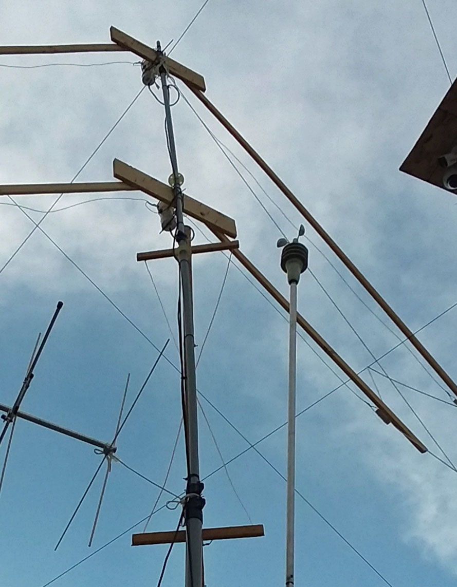Mounting and glueing the bottom cross beam to the main mast. Feed point will be down yonder here area.