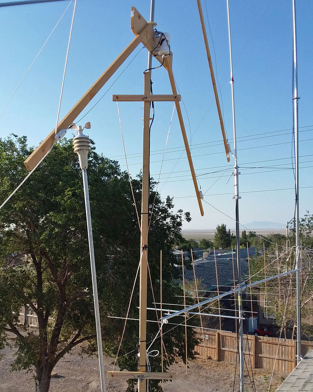 This is where it is temporarly mounted outside on a fiberglass mast for testing purposes, until I figure out where I will finally mount it at. The 2 wood inverted "V" antennas above it, are where my 6 and 10 meter antennas are at. The HourGlass antenna is about at 20ft for right now.