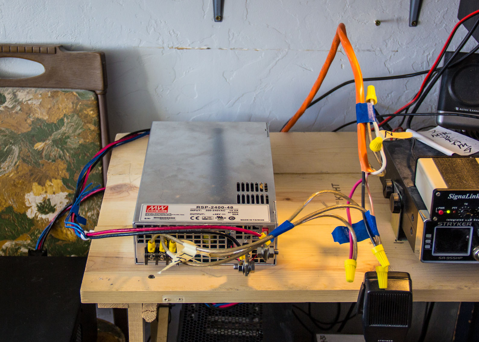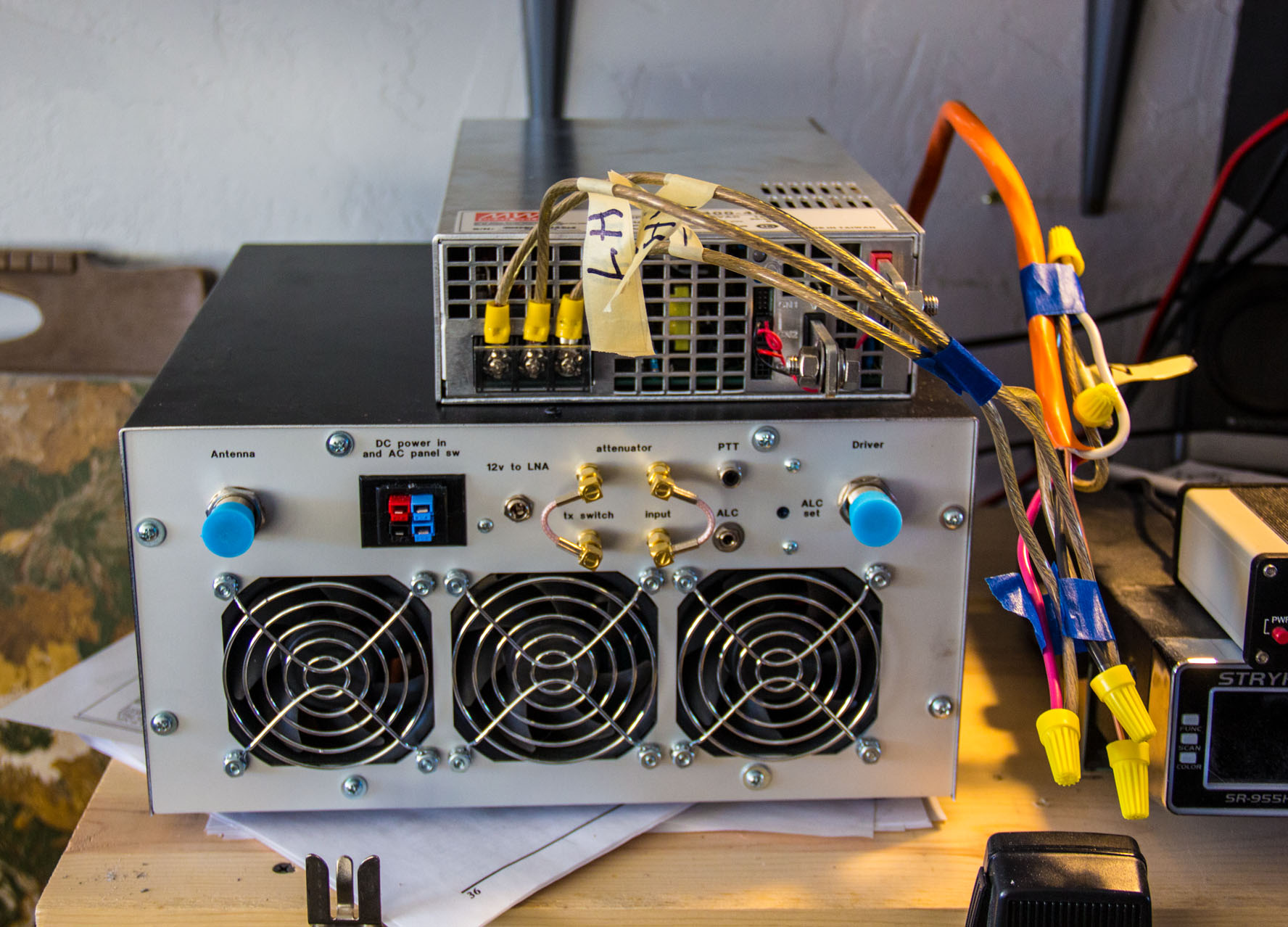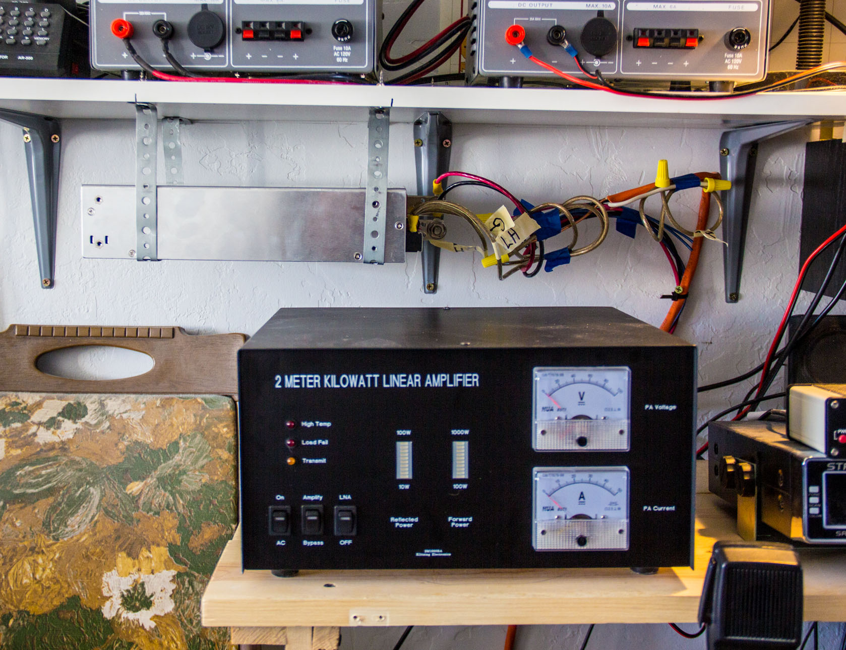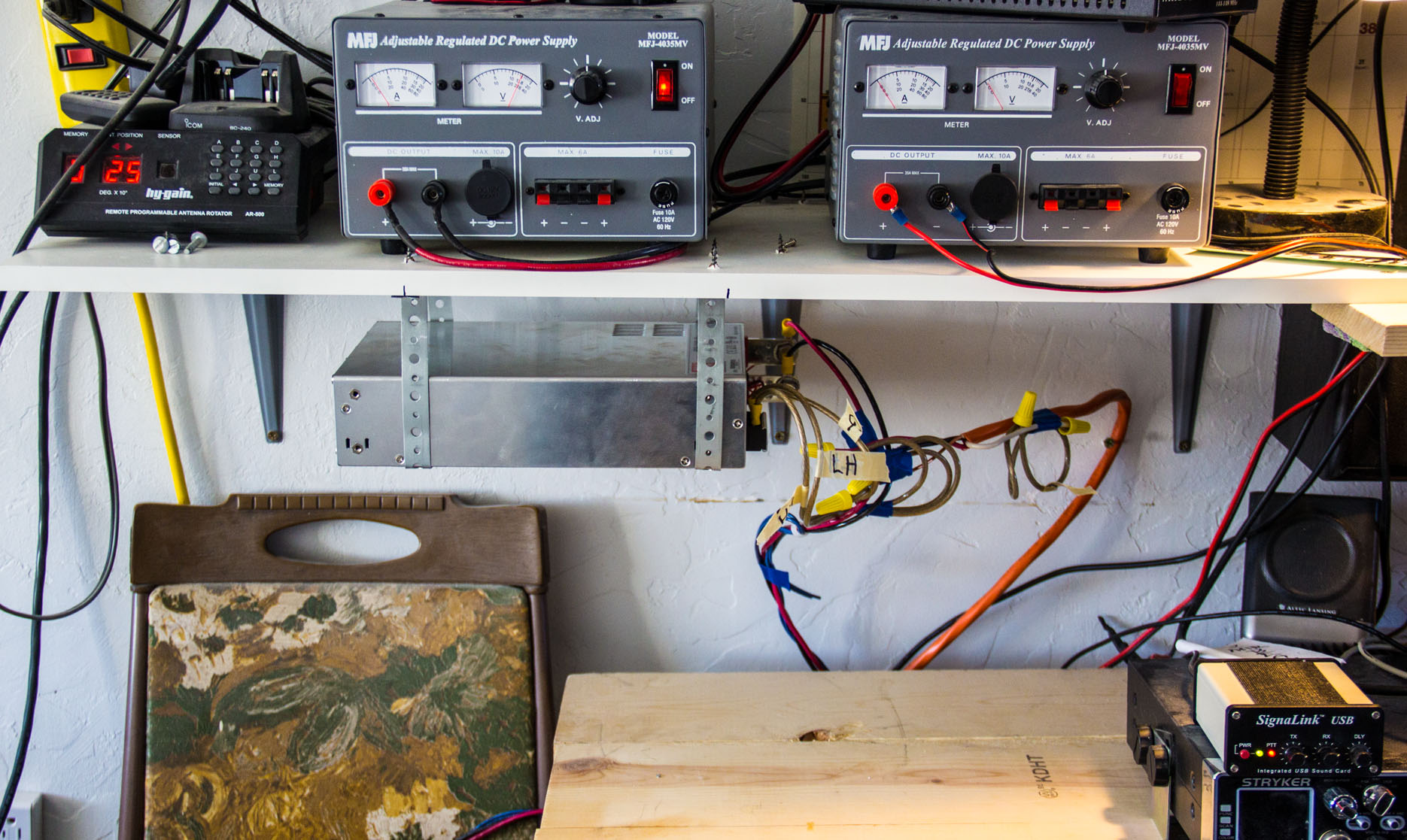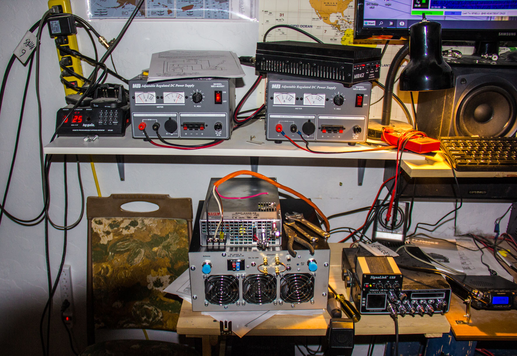 Well.. it looks like the empty space there at the left of the table, is where I am going to put the power supply and the big amplifier at. I moved the one 35A supply and the Mirage 150w amp up to the top shelf for now, until I can figure out where to put the 150w so its not just sitting on top of the supply. Just temporary for the amp for now.