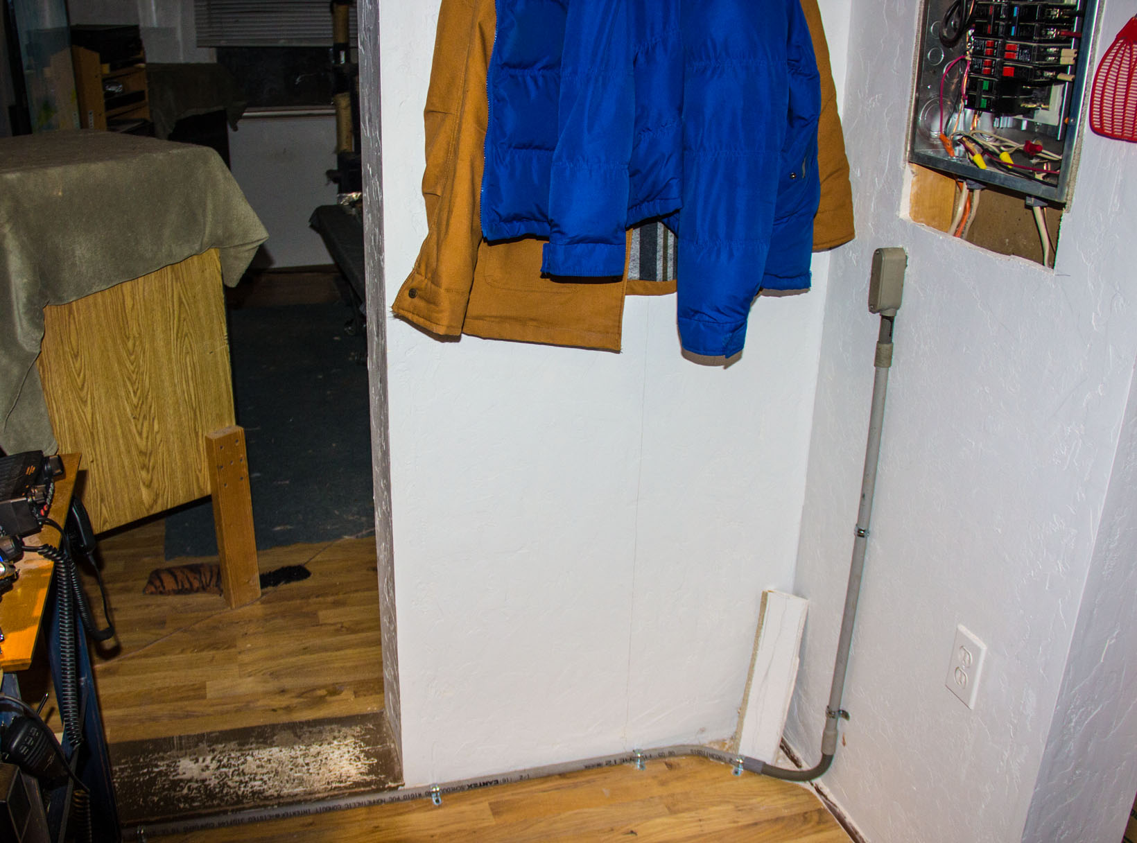 This is the finished project of my electrician freind helping me hook up in breaker box and making the pretty gray pipe with wire in it, over to my radio area. Luckely, its not too far away for me. And.. I wont trip over the thing when I go through the doorway.. HiHi !