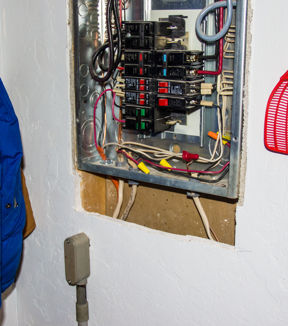 View of my nearby breaker box panel before intalling / running the big power wires. The bottom left green colored breaker is where it s going to hook in to from. Wires there now, not used in home.